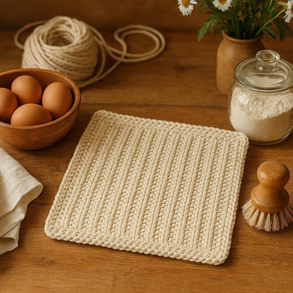 A sturdy, reusable 8" × 8" dishcloth featuring the classic sailor’s rib stitch and a clean garter‑stitch border. Perfect for kitchens, gift baskets, market tables, or pairing with handmade soaps.